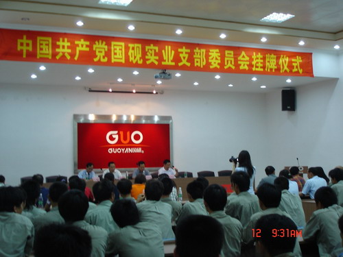 儀式由街黨工委副書(shū)記趙思能同志主持,街道辦事處主任周?chē)?guó)棟、公司董事長(zhǎng)總經(jīng)理王聲位分別在掛牌揭幕儀式上作了熱情洋溢的講活,并為國(guó)硯實(shí)業(yè)有限公司黨支部正式掛牌揭幕。