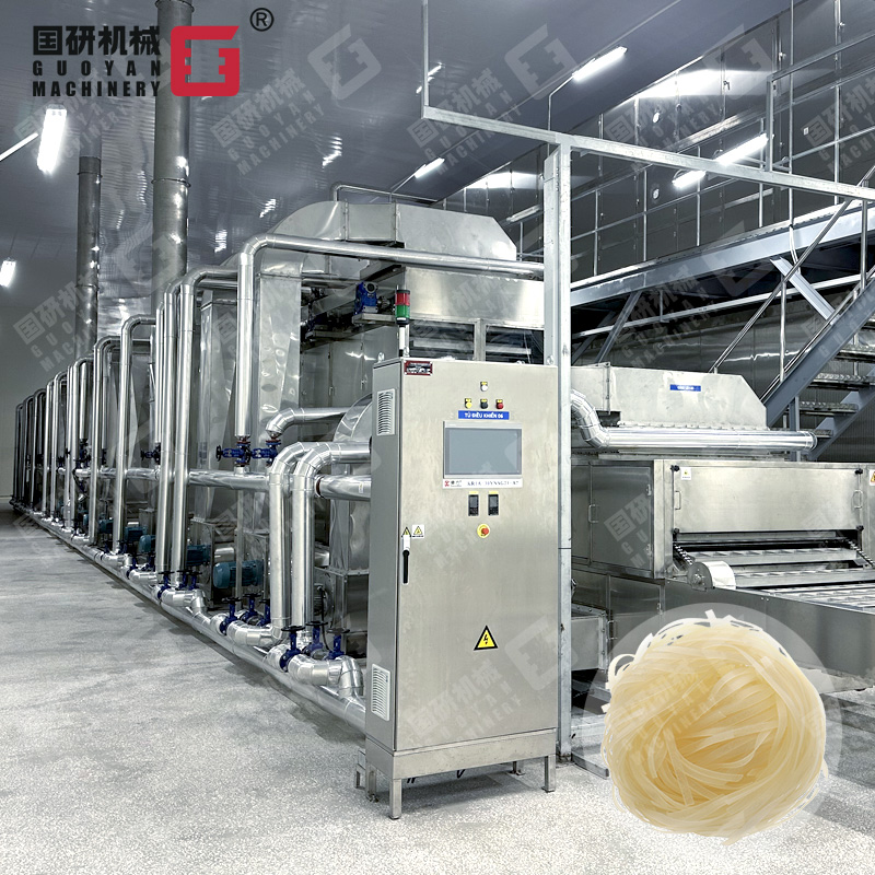 大米→射流提升輸送→除砂石→射流洗米、浸米→米水分離→磨漿→篩濾→儲漿→蒸粉片→粉片預干→低溫自動吊掛老化→自動切條、切斷→定重壓形→干燥→包裝→成品